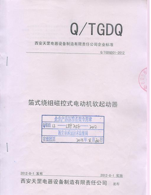 由于磁控式软起动器产品,国家没有相应的国家执行标准,所以由磁控软起行业的技术领导企业天罡磁控公司制定了企业标准。